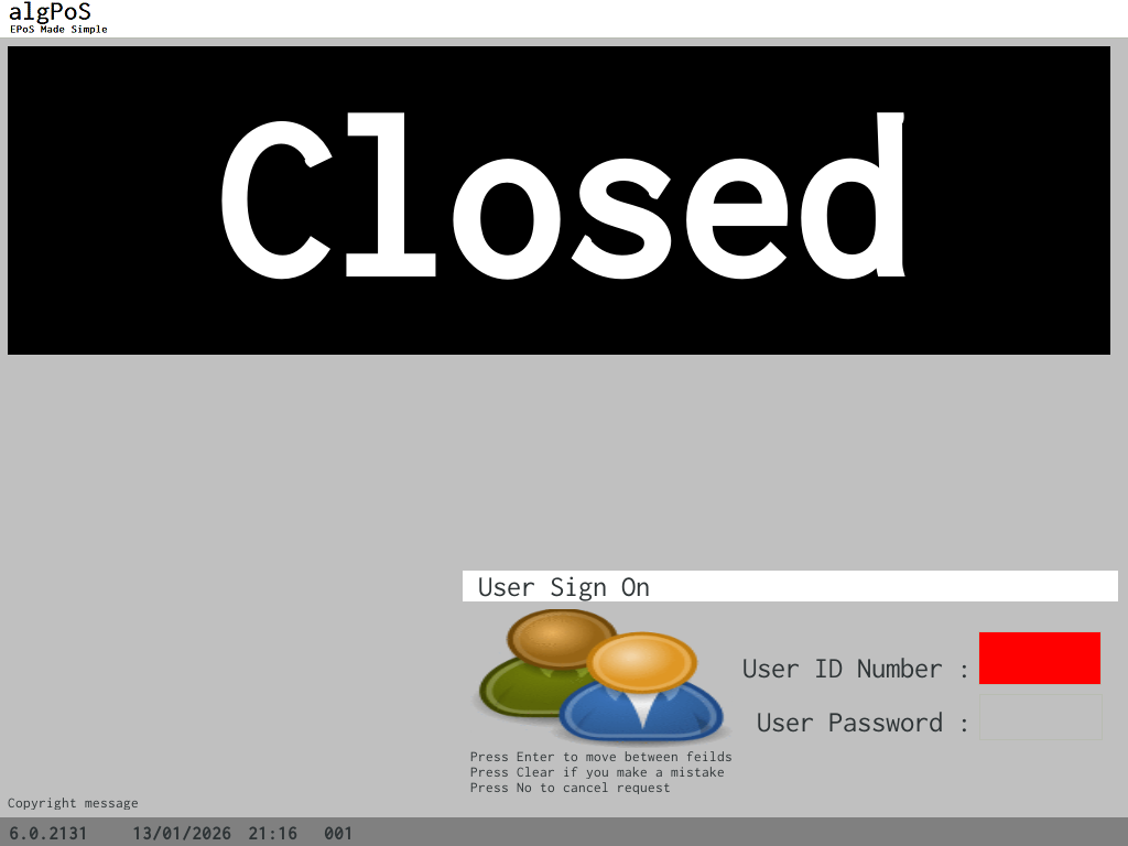 At algPoS we have always has security at the heart of our systems. So when a user has signed off the Point of sale the system is Locked.